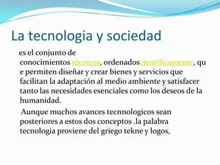Este documento describe la tecnología y su relación con la sociedad. Explica que la tecnología se refiere a los conocimientos técnicos ordenados científicamente que permiten crear bienes y servicios para satisfacer las necesidades humanas y adaptarse al medio ambiente. También distingue entre tecnología, que generalmente implica máquinas, y técnica, que es más manual y empírica. Además, resume brevemente la historia de la tecnología desde sus orígenes prehistóricos hasta el desarrollo de muchas