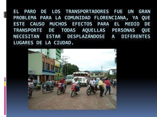 El documento describe brevemente un paro de transportadores en Florencia que causó problemas para el transporte de personas que necesitaban desplazarse por la ciudad. También resume una clase de tecnología en la que el profesor Flavio Ochoa tomó lista, presentó una nueva página web para tareas llamada SlideShare y pidió a los estudiantes crear diapositivas en PowerPoint.