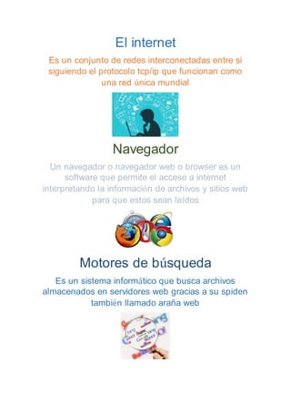 El documento describe varios aspectos clave de Internet y sus servicios, incluyendo que Internet es una red mundial de redes interconectadas que usan el protocolo TCP/IP, los navegadores permiten acceder e interpretar la información de sitios web, los motores de búsqueda buscan archivos en servidores web, los chats y foros permiten conversaciones entre usuarios, y sitios como Gmail y Outlook permiten crear correos electrónicos. También describe a SlideShare como un sitio para compartir presentaciones y otros archivos, subiéndolos tr