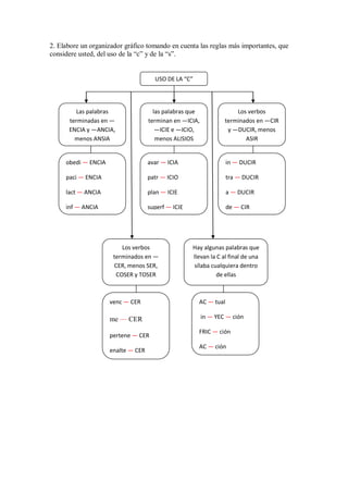 El documento presenta tres actividades sobre el uso de mayúsculas, la "c" y la "s" en español: 1) Una constelación de ideas sobre el uso de mayúsculas, 2) Un organizador gráfico sobre el uso de la "c", y 3) Escribir superlativos aplicando correctamente la "c" o la "s".