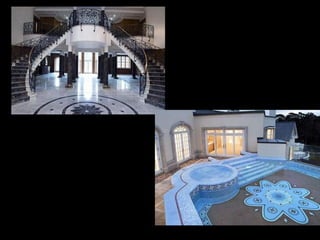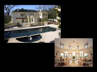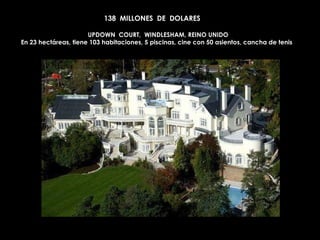 El documento presenta las 10 mansiones más caras del mundo según la revista Forbes, con precios que van desde los 138 millones de dólares hasta los 65 millones. Las mansiones se encuentran en diferentes países como Reino Unido, Colorado, Florida, Turquía, Nueva York y California, e incluyen características lujosas como grandes extensiones de terreno, múltiples habitaciones, piscinas, canchas deportivas, establos y vistas espectaculares.