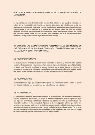 El documento explica la importancia del método en las ciencias de la cultura, al ayudar a establecer orden e investigación y aprovechar estudios previos para sacar nuevas conclusiones. También describe características fundamentales de métodos como comprensivo, holístico, dialéctico, predictivo y empírico. Finalmente, establece semejanzas y diferencias entre métodos generales como deductivo e inductivo.