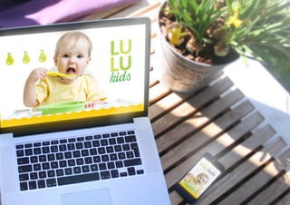 El documento presenta la identidad visual de la marca LULUKIDS. Describe los colores, fuentes y elementos gráficos que componen la marca. Se enfoca en transmitir conceptos de confianza, salud, diversión y alegría a través de la paleta de colores y diseño de la marca.