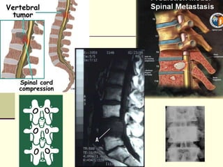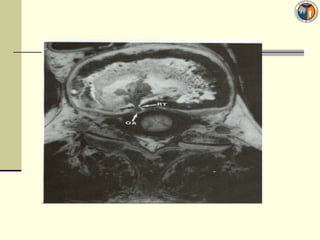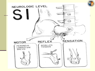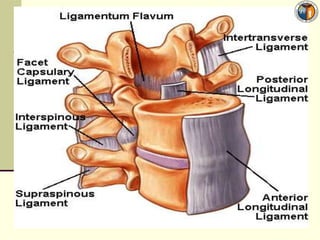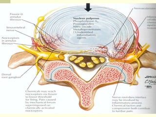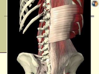 Este documento trata sobre el síndrome de dolor lumbar. Presenta objetivos como reconocer síntomas graves y diferenciar entre lumbago simple y complicado. Explica la anatomía relevante y la historia natural del dolor lumbar, que suele ser de buen pronóstico. Describe cómo evaluar al paciente para distinguir entre dolor mecánico común y patologías graves como tumores o infecciones. Revisa indicaciones de tratamiento y pronóstico dependiendo del caso.