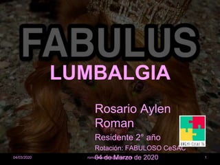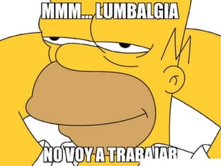 El documento presenta el caso de un paciente de 50 años que consulta por lumbalgia aguda sin antecedentes de traumatismo. En el examen físico no se encuentran signos de alarma. Se realiza diagnóstico de lumbalgia y se indica tratamiento con analgésicos y reposo por un corto periodo, además de solicitar radiografía de columna y cita de control.
