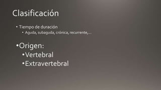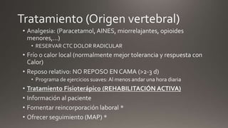 Este documento resume los diferentes tipos de dolor lumbar, incluyendo lumbalgia de origen raquídeo que puede irradiarse a las piernas, dolor muscular y contracturas, y dolor radicular que se extiende por territorios de las extremidades inferiores. También describe signos como la prueba de Lasègue que pueden indicar radiculopatías, y señala que en presencia de síntomas alarmantes como debilidad muscular o disfunción podrían requerirse pruebas complementarias para descartar condiciones como estenosis del canal