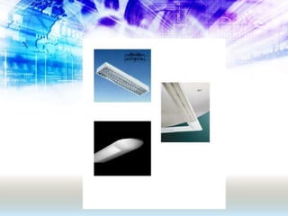 Una luminaria representa un sistema completo de iluminación que consiste en un cuerpo, portalámparas, lámparas y un sistema óptico. Las luminarias distribuyen adecuadamente la luz, evitan el deslumbramiento y satisfacen necesidades estéticas. Se clasifican según cómo distribuyen la luz, incluyendo directa, semi-directa y difusa. Existen diversos tipos para lámparas incandescentes, fluorescentes y de descarga para aplicaciones interiores.