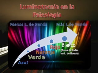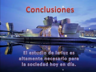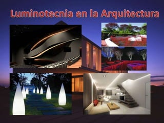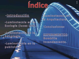 El documento describe las aplicaciones y ventajas de la tecnología LED en la iluminación, incluyendo su uso en decoraciones, teatros, señales y proyecciones. Explica cómo la luminotecnia influye en la arquitectura y cómo los colores de la luz pueden adaptarse a diferentes atmósferas. También presenta un experimento sobre el origen de la bombilla incandescente.