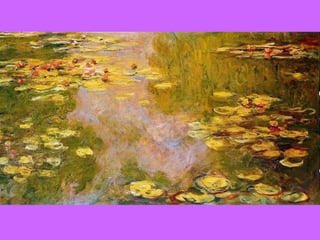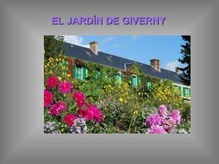El documento describe el jardín de Giverny creado por el pintor impresionista Claude Monet. Monet descubrió el pueblo de Giverny en 1883 y quedó prendado de una casa y sus jardines, primero los alquiló y luego los compró en 1890. Transformó los jardines a su gusto, creando estanques, puentes y plantando sauces y nenúfares. Estos elementos se convirtieron en el foco de sus pinturas, donde buscaba capturar los cambiantes efectos de la luz en el agua y los reflejos