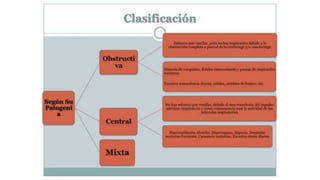 Este documento describe las alteraciones de la función respiratoria relacionadas con el envejecimiento, incluyendo una disminución de la elasticidad pulmonar, un aumento en la producción de moco, y una reducción en la capacidad de los pulmones para obtener oxígeno. También detalla signos y síntomas comunes de condiciones respiratorias como la hiperventilación, hipoventilación e hipoxia, y enumera algunas de las principales enfermedades pulmonares como EPOC, asma y neumonía.