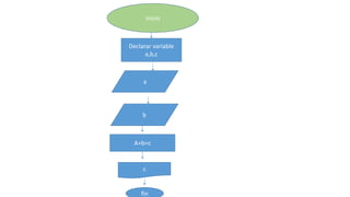El documento describe varios bloques de código que declaran y asignan valores a variables. En cada bloque se declaran variables como enteros o reales, se les asignan valores a través de operaciones matemáticas simples como sumas y multiplicaciones, y se calculan y almacenan los resultados de dichas operaciones.
