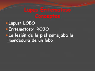 El lupus eritematoso es una enfermedad autoinmune de causa desconocida que afecta principalmente la piel. Puede presentarse como lupus eritematoso sistémico, que afecta múltiples órganos, o como lupus eritematoso cutáneo, que se limita a la piel. El lupus eritematoso cutáneo crónico se caracteriza por placas eritematosas que afectan comúnmente la cara y el cuero cabelludo.