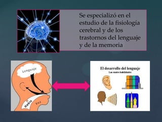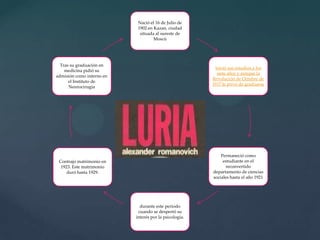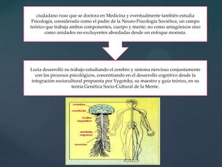 Alexander Luria fue un psicólogo y médico ruso que continuó la tradición neuropsicológica occidental e introdujo un enfoque inspirado en Vigotsky. Desarrolló un modelo de tres bloques funcionales cerebrales - el tronco encefálico, las regiones sensoriales y los lóbulos frontales - y creó pruebas neuropsicológicas para evaluar procesos como la atención, memoria y lenguaje. Sus contribuciones mejoraron la comprensión de las funciones cerebrales superiores y su aplicación en la educ