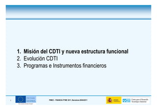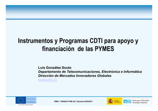 Este documento resume los instrumentos y programas del CDTI para apoyar y financiar a las PYMES. Explica que el CDTI ha evolucionado para convertirse en la principal entidad para impulsar la I+D empresarial en España, con un aumento del 145% en el número de empresas financiadas entre 2005 y 2010. También describe los nuevos programas e instrumentos del CDTI, como INNPRONTA y FEDER-INNTERCONECTA, así como reformas como un tramo no reembolsable básico del 15% para PYMES y del 8% para grandes empresas.