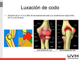 Las luxaciones de codo suponen entre el 11-28% de las lesiones del codo y son más frecuentes entre los 10-20 años. Generalmente son luxaciones posteriores de los dos huesos distales producidas por caídas sobre la mano con el codo en extensión. A menudo vienen acompañadas de fracturas como la epitróclea, el epicóndilo o la fractura-luxación de la "triada terrible" que asocia fractura de coronoides y cabeza radial. Es importante evaluar posibles lesiones neurovasculares antes de la reducción.
