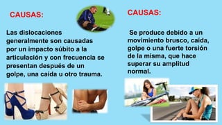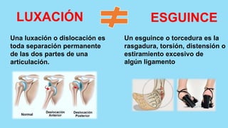 Este documento describe las diferencias entre esguinces y luxaciones. Un esguince implica el estiramiento o desgarro de ligamentos, mientras que una luxación es la separación permanente de las partes de una articulación, generalmente causada por un impacto repentino. Ambos pueden causar dolor agudo, inflamación y pérdida de función. El tratamiento incluye hielo, compresión, elevación e inmovilización de la articulación afectada, así como posibles radiografías, tomografías o resonancias magnéticas para diagnosticar la