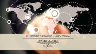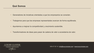 El documento describe un cluster de turismo de lujo en España que busca conectar empresas, mejorar la competitividad y crecimiento sostenible a través de iniciativas orientadas, generar empleo e incrementar los ingresos del sector turístico mediante el desarrollo de proyectos conjuntos, la alineación de objetivos y el fortalecimiento empresarial.