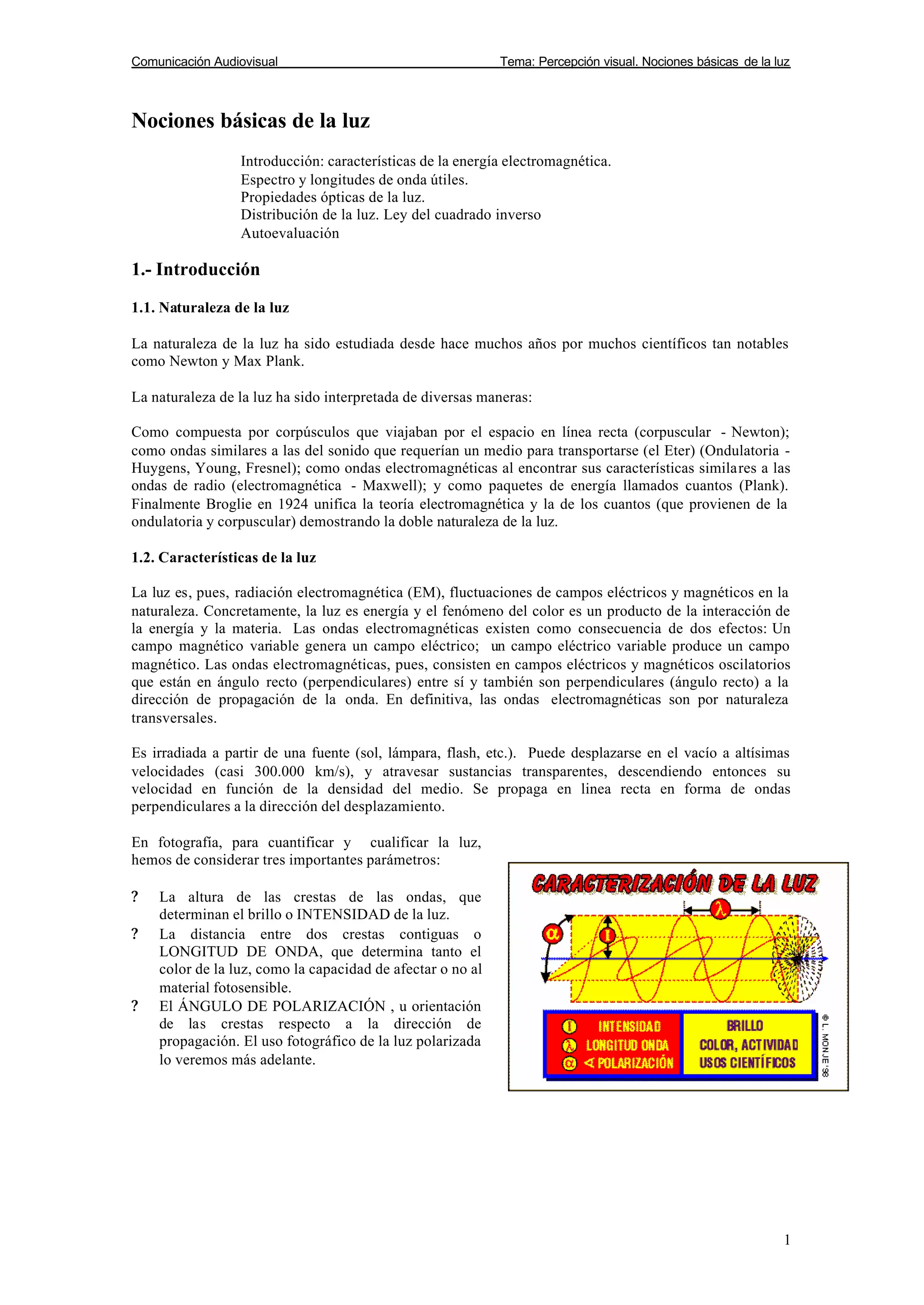 Este documento trata sobre nociones básicas de la luz. Explica que la luz es radiación electromagnética y forma parte del espectro electromagnético junto con rayos gamma, rayos X, ultravioleta, infrarrojo, microondas y ondas de radio. Describe las características y propiedades de cada tipo de radiación electromagnética, incluyendo su longitud de onda y frecuencia. También analiza las propiedades de la luz visible y cómo es percibida por el ojo humano.