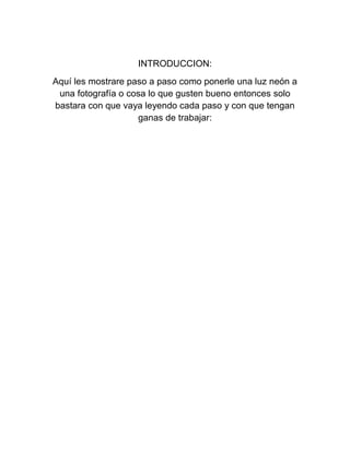 Este documento proporciona un tutorial paso a paso para agregar un efecto de luz neón a una fotografía en Photoshop. Explica los 9 pasos requeridos: 1) duplicar la capa de la imagen, 2) crear una nueva capa, 3) dibujar una línea con la herramienta pluma, 4) curvar la línea, 5) usar el pincel para rellenar la línea, 6) contonear el trazo, 7) simular la presión, 8) ajustar la opacidad y borrar, y 9) aplicar el est