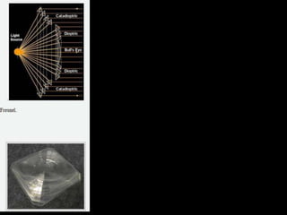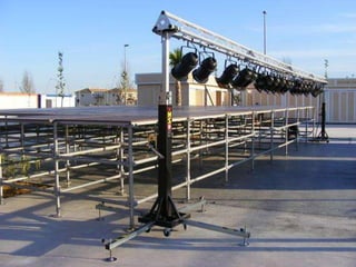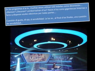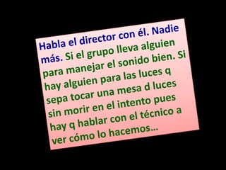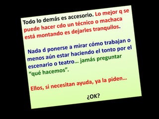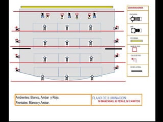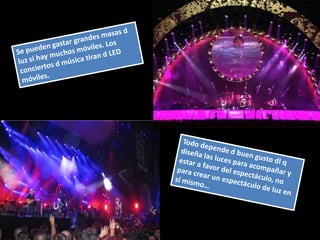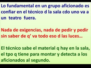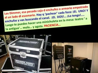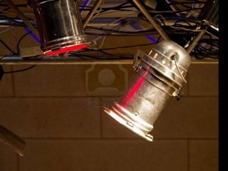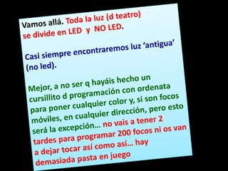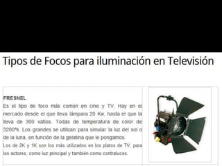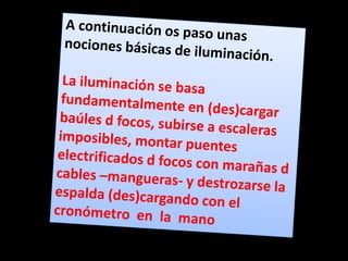 El documento habla sobre la iluminación en teatro y la importancia de confiar en el técnico de luces cuando se actúa fuera de casa. Explica diferentes tipos de focos como los focos PC, Fresnel y de recorte y cómo se usan. También describe elementos como los filtros de color y panoramas y conceptos como la luz frontal, contra y cenital. Finalmente, resume el proceso de iluminación desde los focos hasta la mesa de luces.