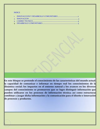 Este documento trata sobre la innovación y el desarrollo comunitario. Explica brevemente la innovación, el cambio técnico y el desarrollo comunitario. También describe cómo la innovación debe ser parte de las soluciones a los problemas de las comunidades y cómo servir a una comunidad requiere respetar su cultura y liderazgo para crear un ambiente propicio para la innovación.