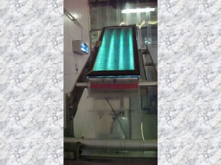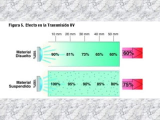 El documento habla sobre la radiación ultravioleta y sus diferentes aplicaciones. Explica que la radiación UV se divide en UV-A, UV-B y UV-C dependiendo de su longitud de onda, y que la mayoría de los rayos UV que llegan a la Tierra son UV-A. También describe cómo se usa la luz ultravioleta para esterilizar, detectar fluidos corporales, y matar microorganismos entre otras aplicaciones.
