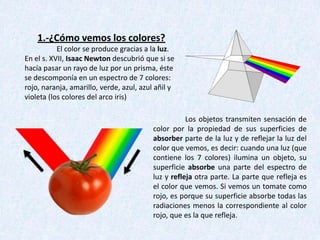 Este documento explica cómo funciona la visión del color. Isaac Newton descubrió que la luz blanca se descompone en un espectro de colores al pasar a través de un prisma. Los objetos reflejan ciertos colores de luz y absorben otros, lo que hace que se vean de determinados colores. Existen dos tipos de color: color-luz, producido por fuentes luminosas, y color-pigmento, producido por pinturas. Cada color se define por su tono, valor y saturación. Los colores también transmiten sensaciones y emociones.