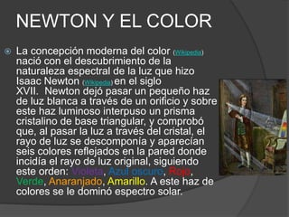 Isaac Newton descubrió la naturaleza espectral de la luz en el siglo XVII al pasar un rayo de luz blanca a través de un prisma y descomponerla en los colores del espectro visible. La luz y los pigmentos producen color de manera diferente. La suma de luces primarias como el rojo, verde y azul crea color de manera aditiva, mientras que la sustracción de colores complementarios como magenta, cian y amarillo lo hace de forma sustractiva. La percepción del color depende de la