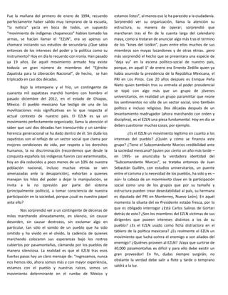 El documento analiza los principales actores y contrastes en la escena política y social de México, incluyendo el Ejército Zapatista de Liberación Nacional (EZLN), Andrés Manuel López Obrador, el grupo hacktivista Anonymous, y los partidos políticos como el PRI y MORENA. Plantea preguntas sobre la legitimidad y financiamiento del EZLN, así como sobre las motivaciones e influencias detrás de estos diferentes grupos y su papel en el rumbo de México.