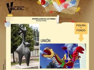 El documento describe diferentes modos de interrelación entre formas como distanciamiento, toque, superposición, penetración, unión, sustracción, intersección y coincidencia. Se pide buscar un ejemplo de cada modo de interrelación en obras tridimensionales.