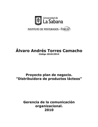 Este documento presenta un plan de negocio para la creación de una distribuidora de productos lácteos llamada Distribuciones A.T.C. en el sur de Bogotá. La empresa funcionará como subdistribuidora de Alpina y tendrá a su cargo la distribución de sus productos en 7 zonas seleccionadas. El documento incluye un análisis del entorno del sector lácteo a nivel mundial y local, un estudio de mercado de la zona de cobertura, y estudios técnico, económico-financiero y administrativo para