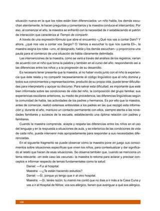 El documento describe una actividad diaria llamada "Tiempo de compartir" realizada en un jardín de infantes. Durante este tiempo, los niños comparten experiencias personales de forma rotativa, con un niño hablando a la vez mientras los demás escuchan. La maestra juega un papel importante apoyando la expresión lingüística de cada niño y asegurando que todos tengan la oportunidad de hablar. A lo largo del año, los niños van ganando autonomía en su expresión a través del apoyo continuo de la maestra