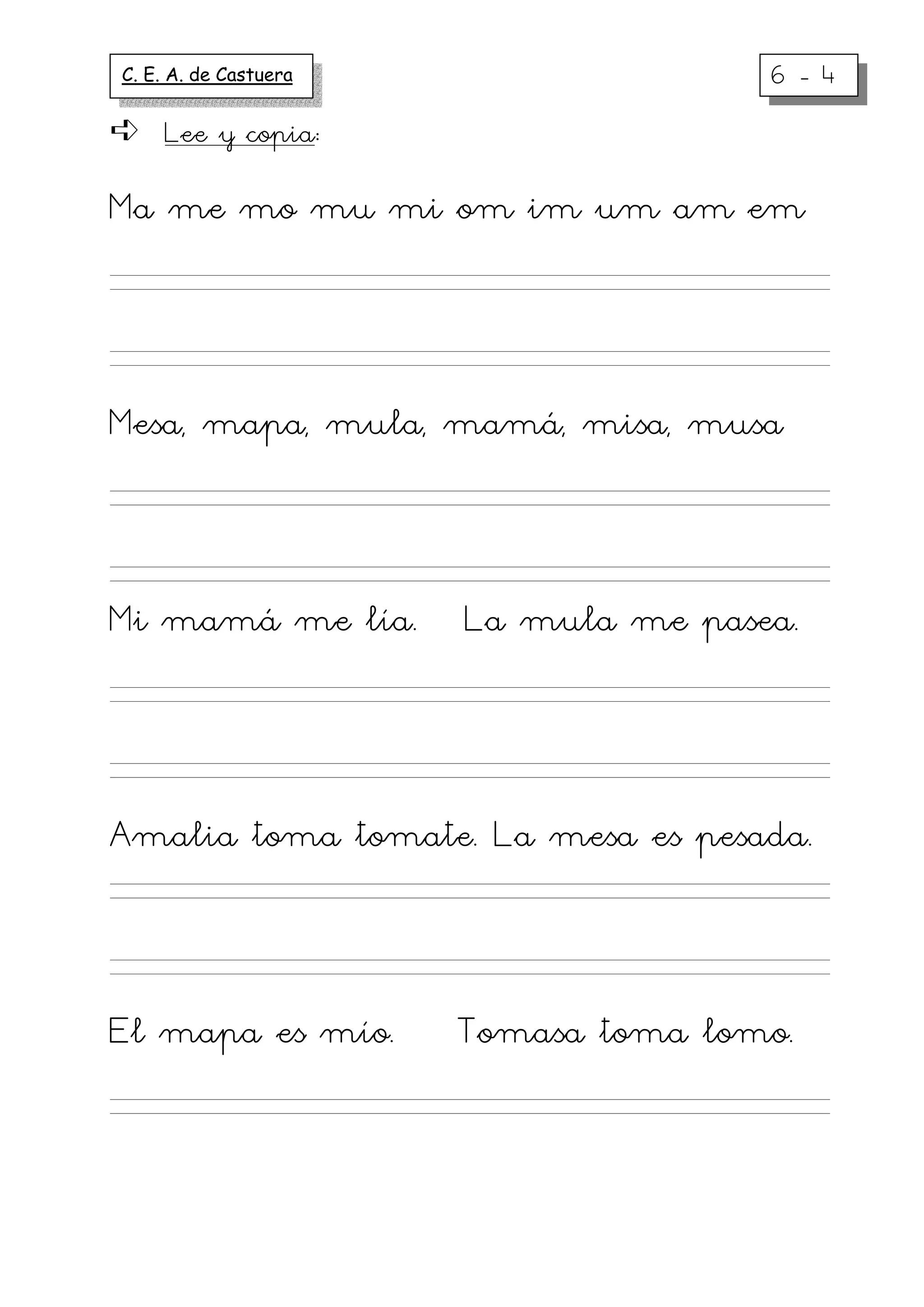 El documento presenta una lista de palabras que comienzan con las letras "ma" y "mu", seguidas de oraciones cortas que usan esas palabras. Contiene ejemplos de palabras como mesa, mapa, mula, mamá y frases como "Mi mamá me lía" y "La mesa es pesada" para practicar la escritura y pronunciación de palabras que comienzan con esas letras.