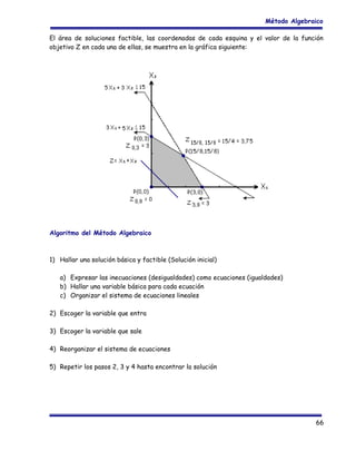 El documento describe el método algebraico para resolver problemas de programación lineal. Explica que el método usa álgebra y lógica matemática. Luego, presenta un ejemplo con dos variables para ilustrar los pasos del algoritmo, que incluyen encontrar una solución básica factible, seleccionar variables que entran y salen, y reorganizar el sistema de ecuaciones repetidamente hasta alcanzar la solución óptima. Finalmente, anticipa que un segundo ejemplo tendrá tres variables de decisión y considerará diferentes tipos de restricciones, lo