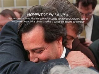 El documento contiene reflexiones sobre la vida y las relaciones. Habla de momentos en que se echa de menos a alguien, de no quedarse mirando puertas cerradas sino abriendo otras, y de encontrar a alguien que haga sonreír el corazón. También anima a soñar y a sacar lo mejor de cada situación, a dejar atrás el pasado para mirar hacia el futuro, y a vivir de forma que cuando se termine la vida se esté sonriendo.