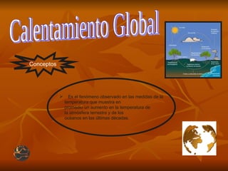 La Tierra es el único planeta en el sistema solar que puede sustentar vida gracias a su atmósfera, que mantiene temperaturas adecuadas y contiene gases como el oxígeno y el nitrógeno. La atmósfera también genera los fenómenos climáticos y contiene gases de efecto invernadero que calientan la superficie. El calentamiento global ha causado un aumento de las temperaturas en las últimas décadas debido al aumento de estos gases.