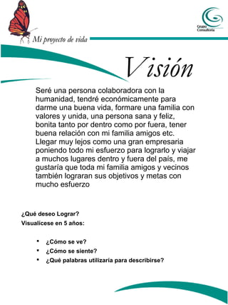 Este documento presenta el proyecto de vida de una persona. Su visión es ser una persona colaboradora, sana, feliz y exitosa profesionalmente. Desea formar una familia unida y viajar mucho. Identifica valores como la amistad, competencia y familia. Su misión es ser respetuosa y lograr todos sus sueños con esfuerzo. El documento también analiza los recursos, oportunidades, limitaciones y amenazas que tiene la persona para alcanzar su proyecto de vida.