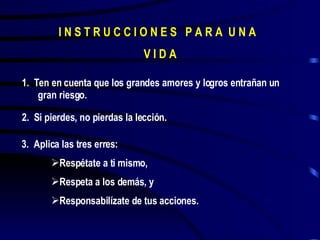 I N S T R U C C I O N E S  P A R A  U N A  V I D A 1.  Ten en cuenta que los grandes amores y logros entrañan un gran riesgo. 2.  Si pierdes, no pierdas la lección. 3.  Aplica las tres erres: Respétate a ti mismo, Respeta a los demás, y Responsabilízate de tus acciones.
