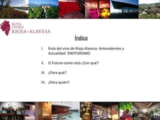 Este documento describe la Ruta del Vino de Rioja Alavesa, una organización creada en 2005 para promover el turismo y la economía en la región de Rioja Alavesa. Explica la historia y el desarrollo del enoturismo en la región, así como los retos futuros como diversificar la economía, fijar la población rural y promover un turismo sostenible y de calidad para beneficiar a toda la comunidad local.