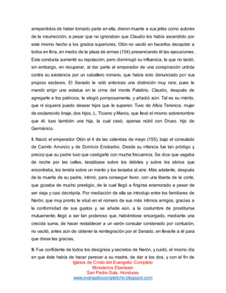 Este documento resume la vida y el breve reinado de Marco Salvio Otón, el octavo emperador romano. Describe su ascendencia noble pero de bajos orígenes, su cercanía a Nerón y cómo llegó a ser su amigo íntimo. Más tarde se volvió contra Nerón y apoyó a Galba, aunque no fue nombrado su heredero como esperaba. Esto llevó a Otón a conspirar para hacerse con el poder por la fuerza, llegando a ser emperador brevemente antes de ser derrocado por Vitelio. Su reinado est