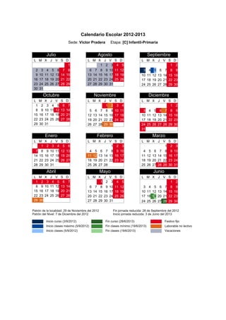 Este documento presenta el calendario escolar para el curso 2012-2013 de la sede Victor Pradera para la etapa de Infantil-Primaria. Incluye los días festivos a nivel local, del nivel educativo y fijos, así como las fechas de inicio y fin de curso, clases y vacaciones. Además, se especifican las fechas de inicio y fin de la jornada escolar reducida.