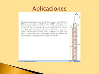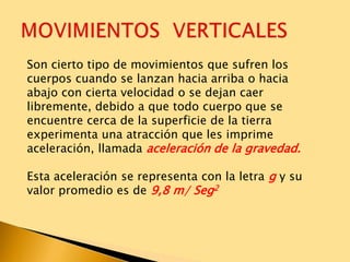 Este documento describe diferentes tipos de movimientos verticales como la caída libre, el lanzamiento vertical y el movimiento semiparabólico. La caída libre es el movimiento de un objeto debido únicamente a la gravedad. El lanzamiento vertical implica un movimiento inicialmente acelerado y luego desacelerado. El movimiento semiparabólico combina un movimiento rectilíneo uniforme horizontal y uno vertical uniformemente acelerado/desacelerado, dando como resultado una trayectoria parabólica.