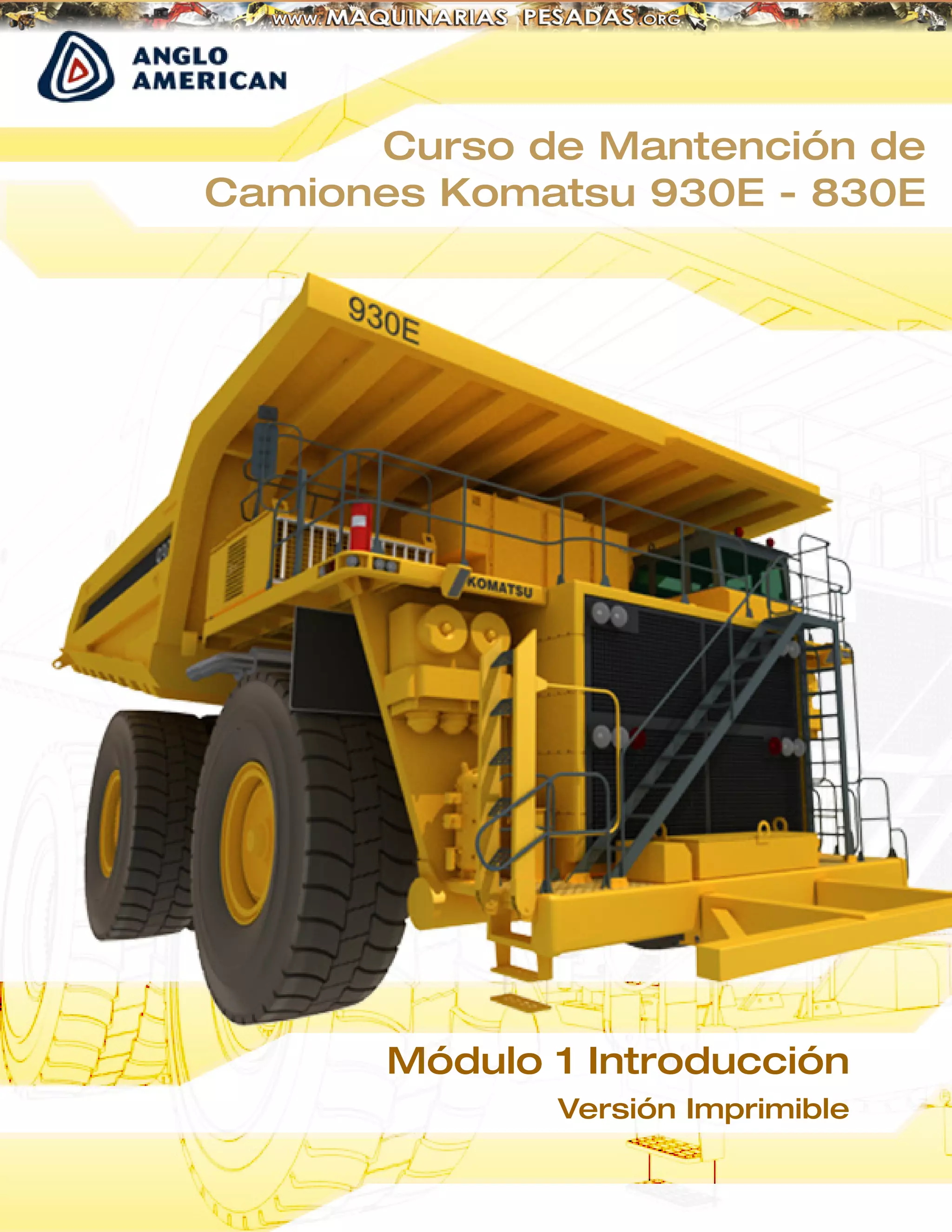 Este documento presenta un curso de mantención para camiones Komatsu 930E-3 y 830E. Describe los sistemas y componentes clave de los camiones, incluyendo el motor, alternador, ruedas motorizadas, suspensión, cabina del operador, dirección hidráulica, retardo dinámico, frenos y especificaciones técnicas. El objetivo del curso es proporcionar conocimientos básicos sobre estos sistemas para que los mantenedores puedan realizar tareas de mantención de manera segura.