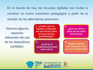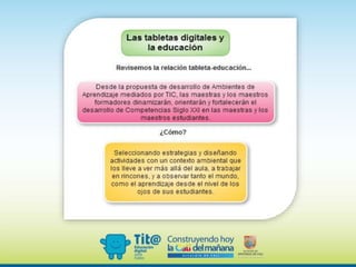 El documento describe las características y usos de las tabletas digitales en entornos educativos. Explica que las tabletas son computadoras portátiles versátiles que pueden usarse para buscar información, almacenar datos, comunicarse y acceder a aplicaciones educativas. También analiza modelos para integrar las tabletas en las aulas y ventajas como el acceso a recursos y desarrollo de habilidades digitales.