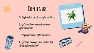 Este documento define los virus informáticos, explica cómo funcionan y se propagan automáticamente, e identifica diferentes tipos de virus como los de programa y los de sobrescritura. Además, ofrece recomendaciones para protegerse contra virus como utilizar filtros de spam y evitar abrir archivos adjuntos o de fuentes desconocidas.