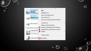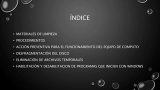 Este documento proporciona información sobre procedimientos de limpieza y mantenimiento de computadoras. Incluye secciones sobre materiales de limpieza comunes, cómo limpiar componentes internos y externos como el teclado, la fuente de poder y el mouse, desfragmentación de discos, eliminación de archivos temporales y habilitación/deshabilitación de programas al inicio.