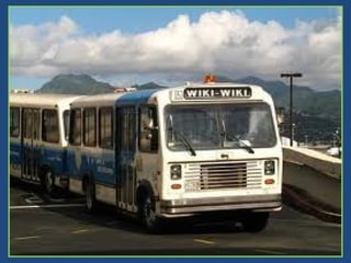 Este documento describe la historia y características de los wikis. Ward Cunningham creó los wikis en 1995 para permitir que grupos de usuarios editaran páginas web de forma colaborativa. Tomó el nombre "wiki" de los autobuses de aeropuerto en Hawái. Los wikis permiten que cualquier persona edite, escriba, guarde y comparta información de forma infinita. Se caracterizan por permitir ediciones rápidas usando marcas hipertextuales simplificadas. No tienen una estructura fija y promueven el trabajo colaborativo sin at