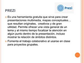 Este documento presenta tres herramientas educativas: Prezi, que permite crear presentaciones multimedia y mapas conceptuales de forma creativa; Symbaloo, que permite guardar recursos en la nube para acceder a ellos desde cualquier ordenador; y Voki, un servicio que permite crear avatares animados personalizados que hablan y pueden usarse para ayudar a los estudiantes a reflexionar sobre textos y pronunciación.