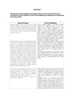 Este documento presenta las opiniones de Ignacio Burgoa y Carré de Malberg sobre la relación entre el Estado, la Constitución y el gobierno. Burgoa sostiene que el Estado no se reduce a un solo elemento como el poder o el territorio, sino que es una integración de varios elementos. Carré de Malberg establece que el derecho nace del Estado ya formado y no puede aplicarse a su formación. También describe los elementos del Estado como la población, el territorio y el poder público. Finalmente, el documento incluye actividades sobre los tipos de