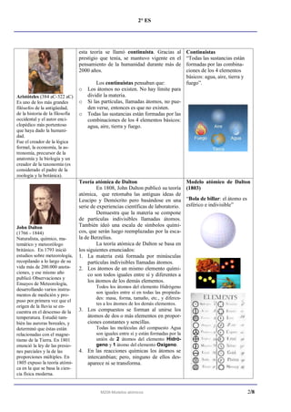 El documento resume los principales modelos atómicos desde la antigua Grecia hasta el descubrimiento del neutrón en 1932. Comienza con los primeros filósofos atomistas como Leucipo y Demócrito, luego pasa a describir el modelo continuo de Aristóteles y los cuatro elementos. Más adelante presenta el modelo atómico de Dalton basado en experimentos y la teoría de Thomson del electrón y el "budín de pasas". Finalmente, describe el descubrimiento del protón por Goldstein y Rutherford y del neutrón por Chadwick.